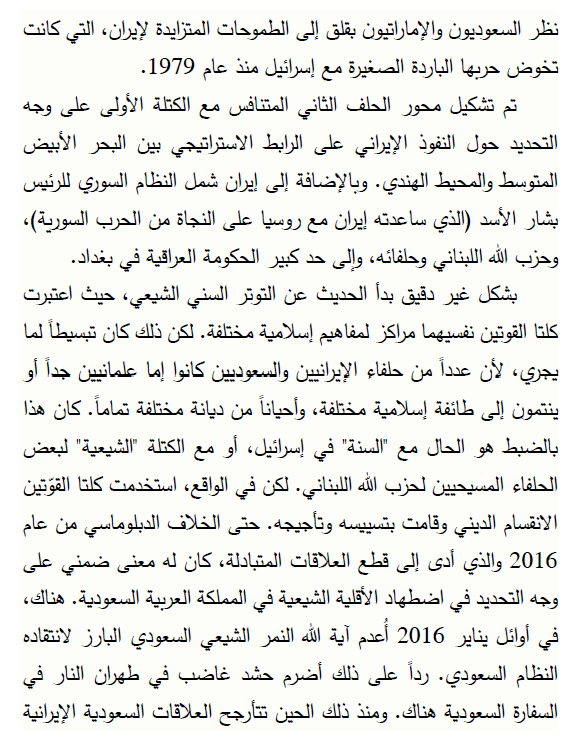 Druhá spojenecká osa konkurující prvnímu bloku se formovala právě kolem íránského vlivu na strategické spojnici mezi Středomořím a Indickým oceánem. Kromě Íránu totiž zahrnula syrský režim prezidenta Bašára Asada (kterému Írán společně s Ruskem pomohl přežít syrskou válku), dále libanonské hnutí Hizballáh a jeho spojence a do značné míry i iráckou vládu v Bagdádu.